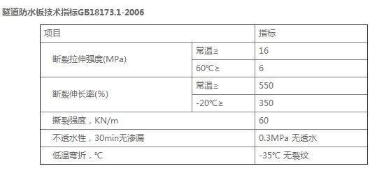 優良的防滲性;高阻隔性;高抗穿刺性;無化學污染;耐酸堿及多種化學物質;優良的延伸率及耐磨性;尺寸穩定性好;粘接性好;施工方便。 隧道防水板一般分為HDPE防水板和EVA防水板,現在也有復合防水板。